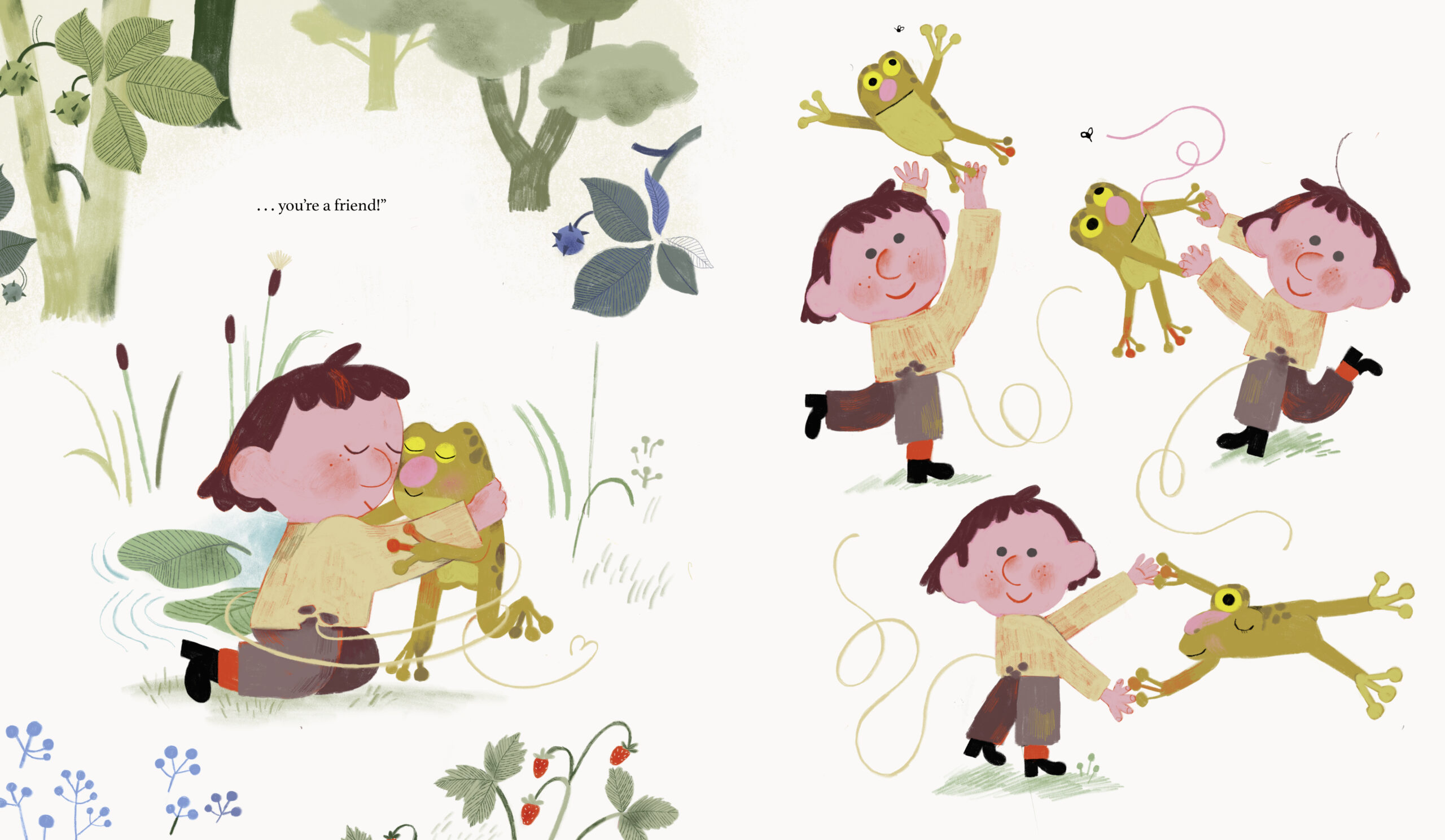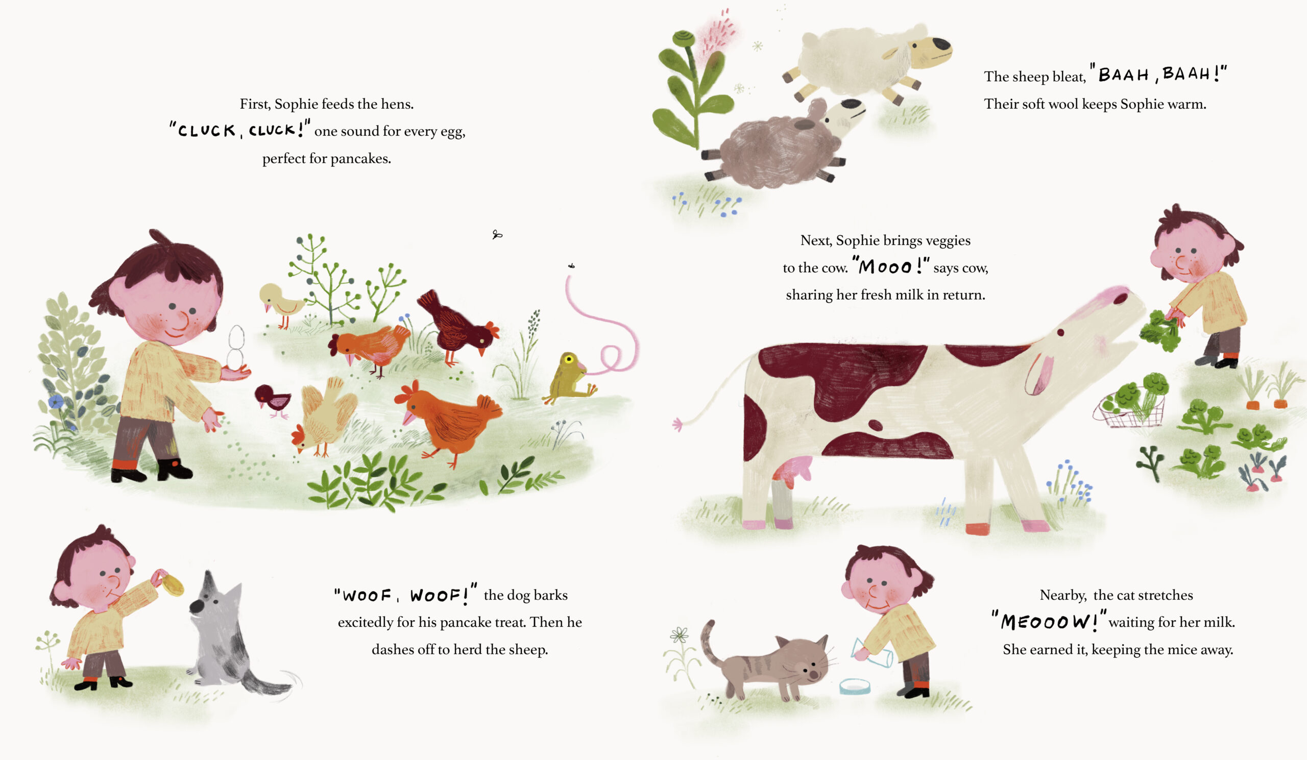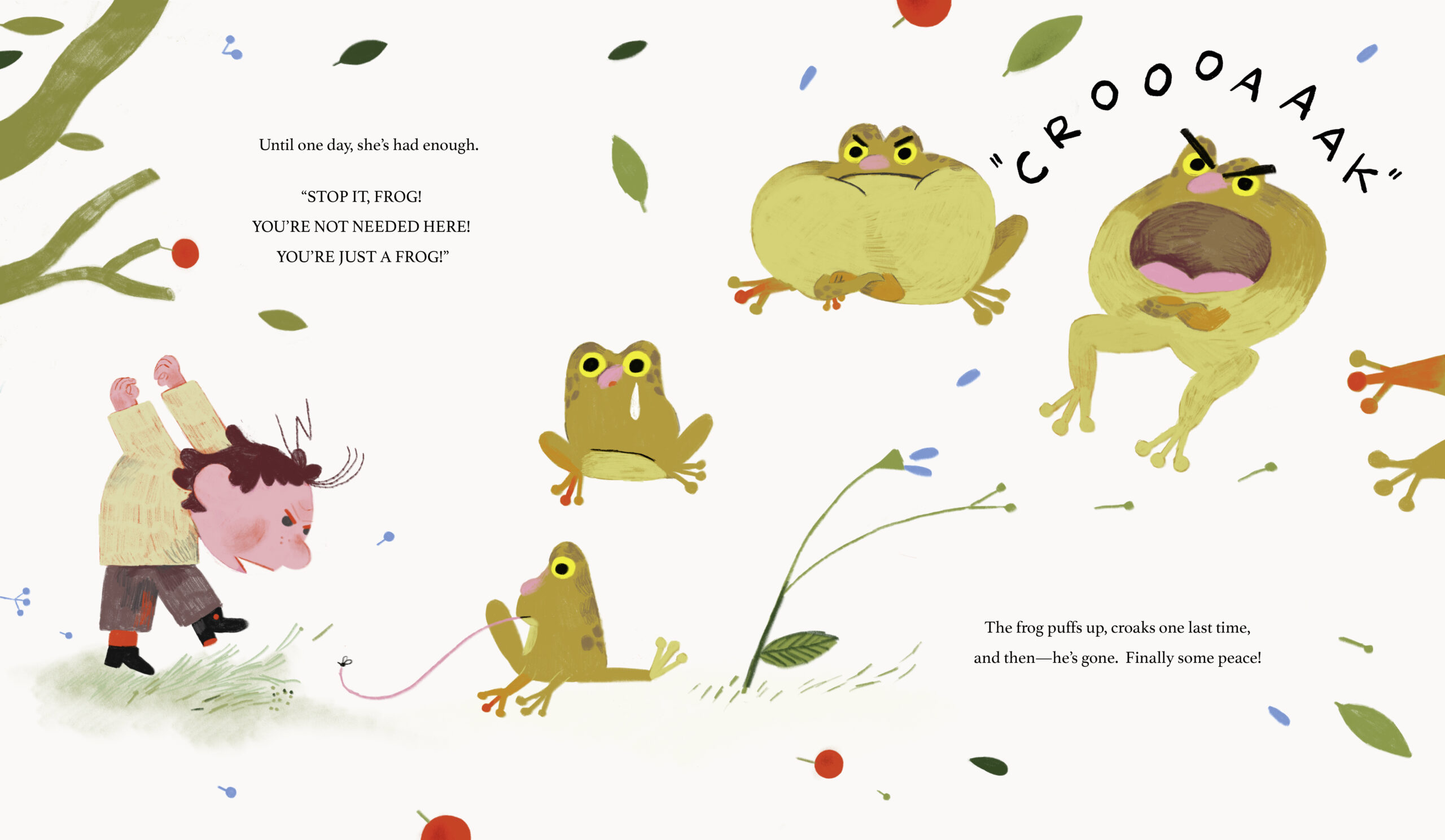 Welcome to Sophie’s farm, where hens cluck, cows moo, and the dog barks for pancakes! Life is peaceful, filled with the friendly sounds of happy animals – except for one. The loud, croaky frog by the pond drives Sophie crazy. When Sophie chases away the frog she thinks is "just a frog," everything on her farm starts to fall apart. No eggs! No milk! Mosquitoes everywhere! Could that pesky croak have been more important than Sophie thought?