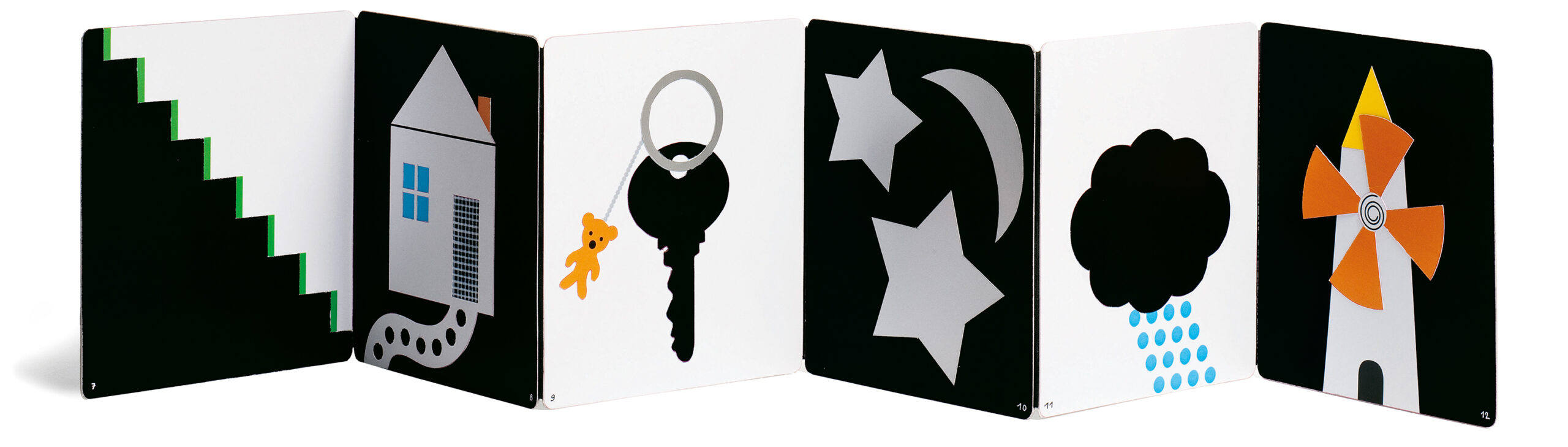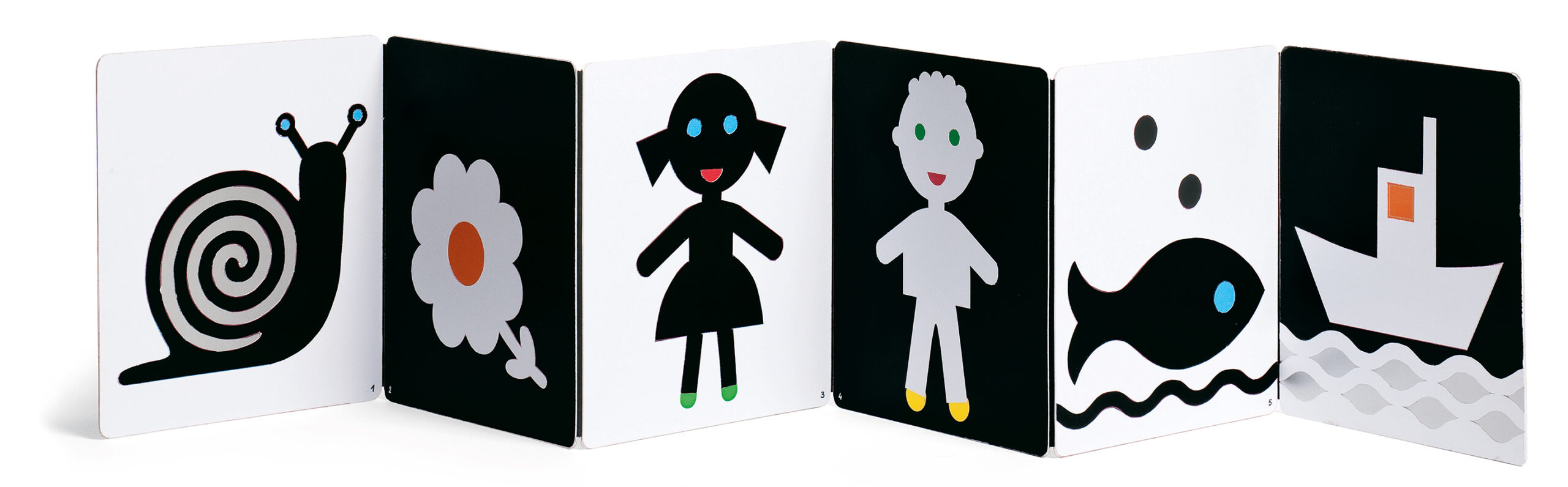 Designed with high-contrast black-and-white images to help develop babies’ eyesight and focus, this gorgeous book includes embossed everyday shapes to explore. Let your child trace the shell of a snail or touch the stars. This beautiful fold-out accordion board book is the perfect first board book for babies.