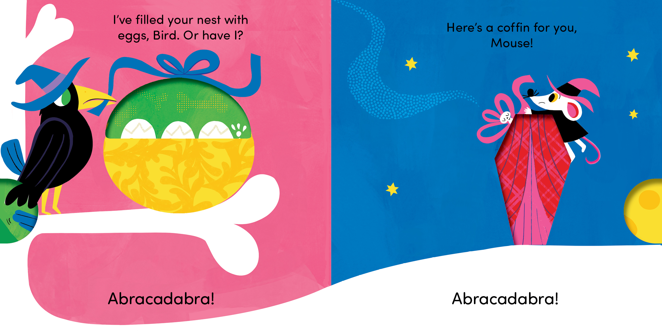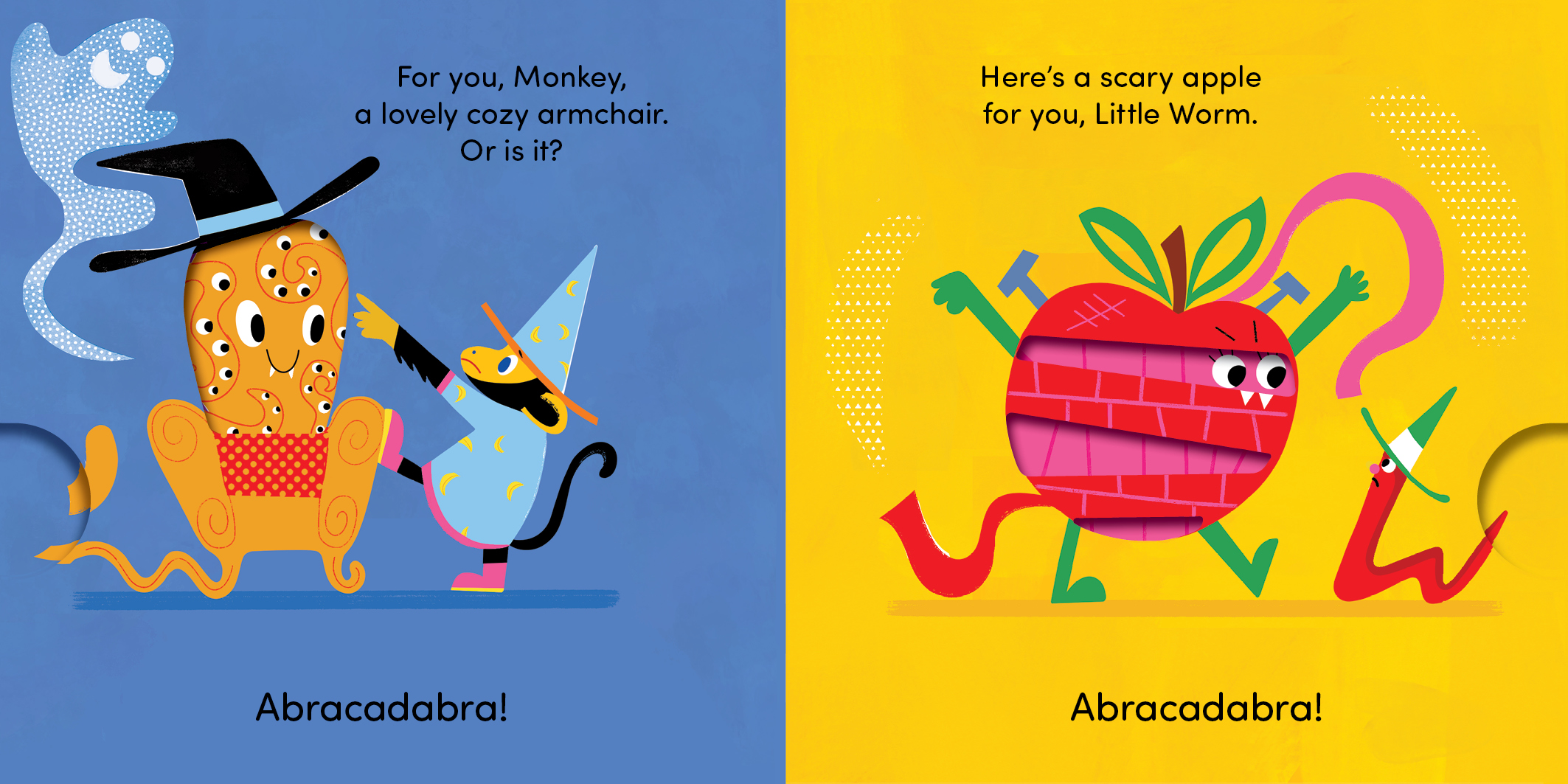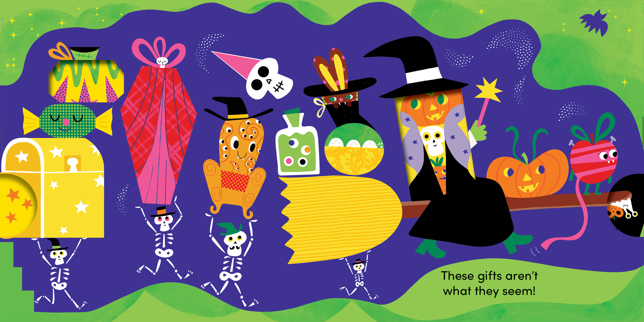 With every pull of the tabs, little hands will discover the magical gifts the witch has conjured, but not all is as it seems! A cozy chair transforms into a monster, a jar of cookies wriggles into spiders, an umbrella flaps into a bat, and more!